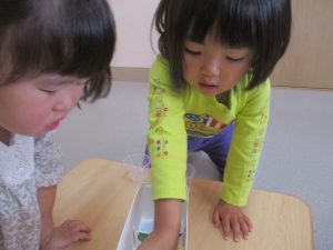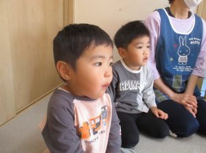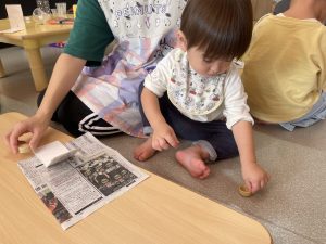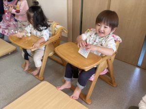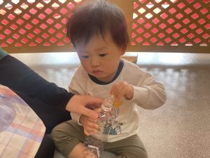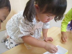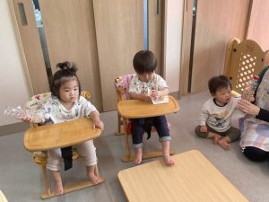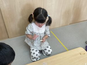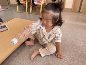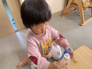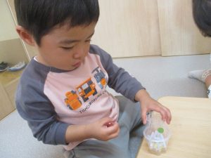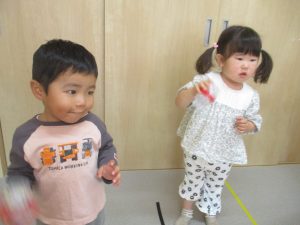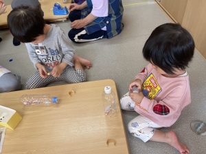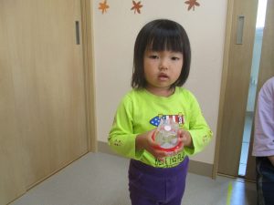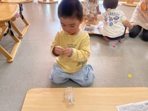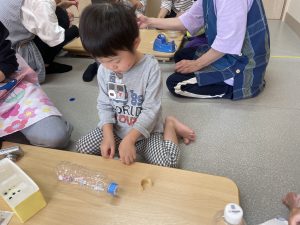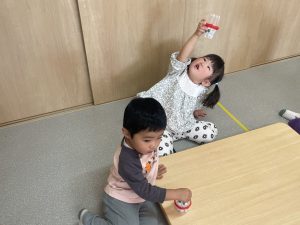 朝会、体操のあと、桃組(0歳児)と楓組(1・2歳児)は、おゆうぎ会へ向けて、手作り楽器を作りました。廃材を使って、中にストローなどを入れたり、シールを貼ったり。