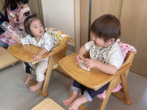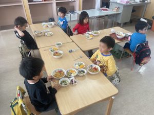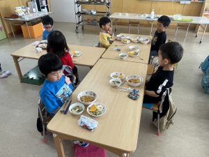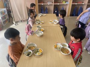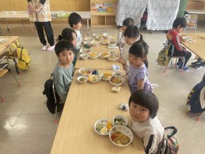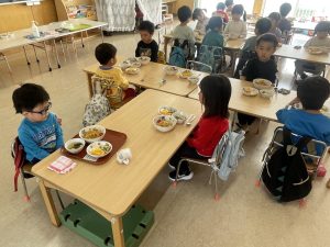 桜組(3歳児)、竹組(4歳児)、松組(5歳児)は、後半は遊戯室で思いっきりあそびました。写真は、給食の様子をご覧ください。