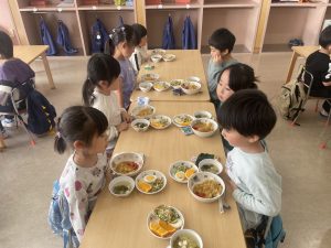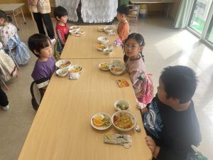 今日の給食メニューは『きのこカレー・さきいかサラダ・ゆで卵・オレンジ・福神漬け・キャベツと豆腐のコンソメスープ』でした。みんなカレーも大好き! おかわりしながら美味しくいただきました。