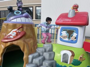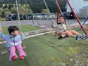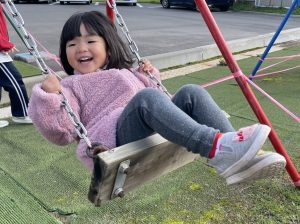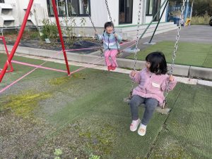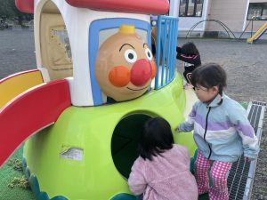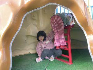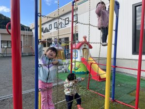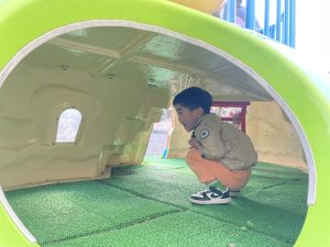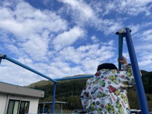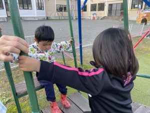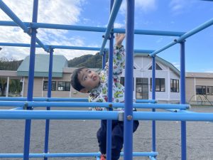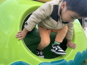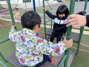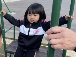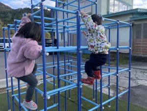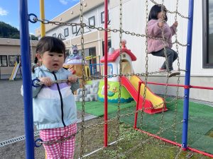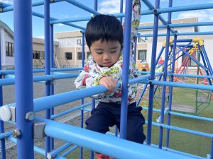 楓2組(2歳児)もお外で元気よくあそんでいる様子をご覧ください。ジャングルジムに登り、遠くのお山の上まで見ていましたよ。
