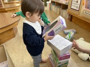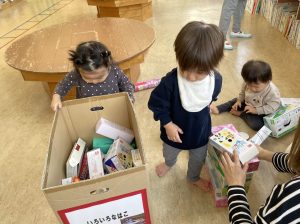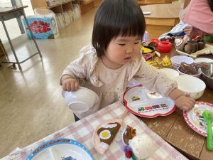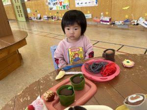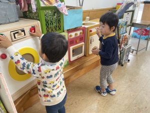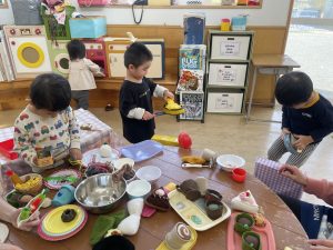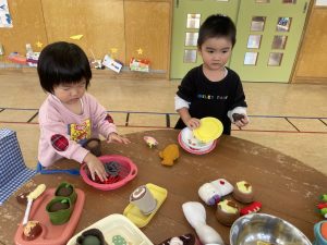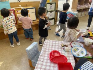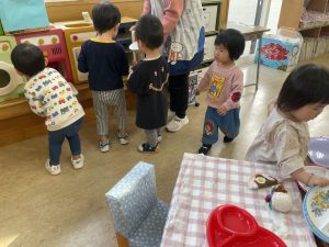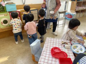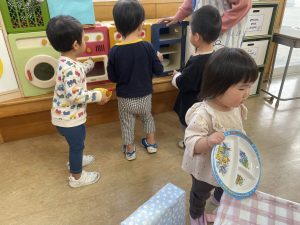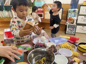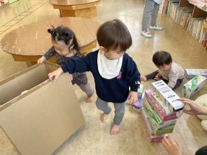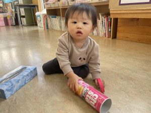 楓1組(1歳児)と桃組(0歳児)は、それぞれにこにこホールで、おままごとをしたり、廃材であそんだりしていました。