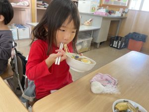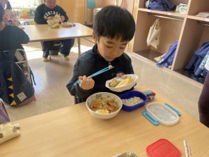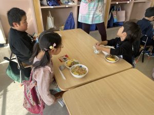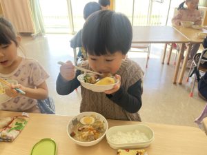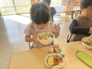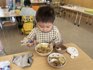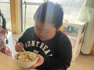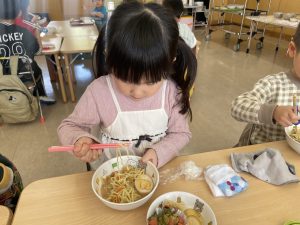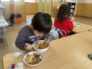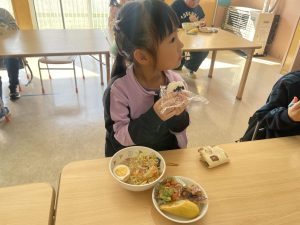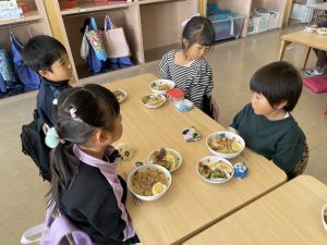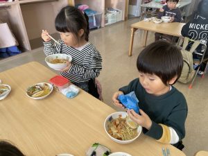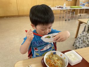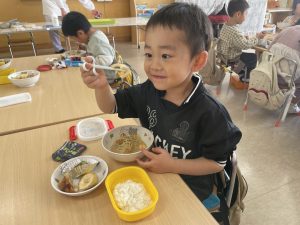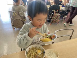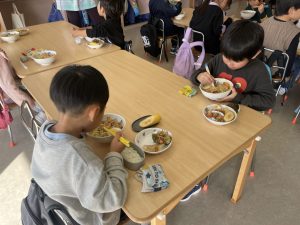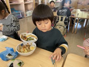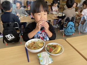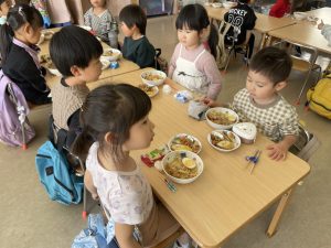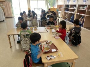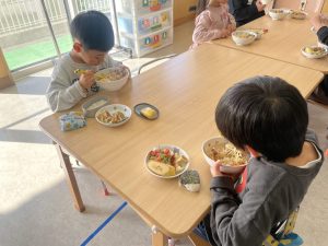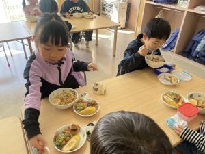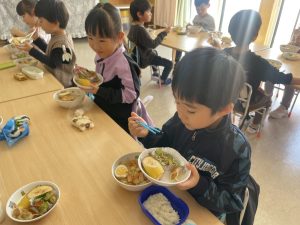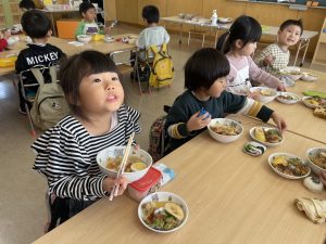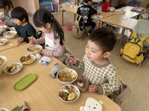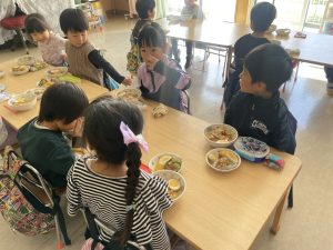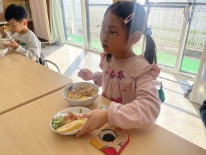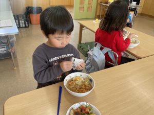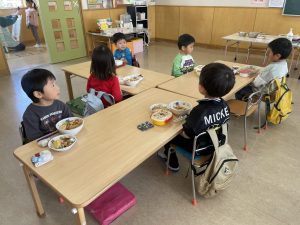 松組(5歳児)、竹組(4歳児)、桜組(3歳児)は、給食の様子をご覧ください。