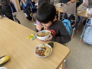 今日の給食メニューは『ちゃんぽんラーメン・煮玉子・焼きギョーザ・トマトのツナ和え・バナナ』でした。麺も人気メニューの一つです。