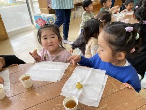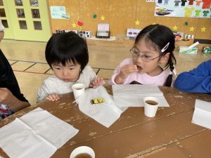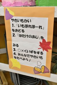 〇×クイズをしたあと、みんなでにこにこホールへ移動し、朝から車庫で焼いてできたホクホクの焼きいもをみんなで美味しくいただきました。