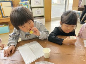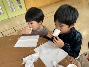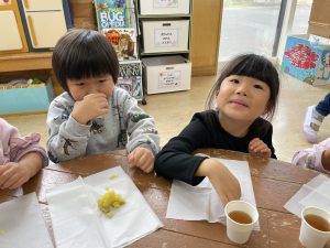 「いいにおい」「まだ熱いね」「フーフーすれば」「おいしそう」などと子どもたちの笑顔。おかわりした子も多かったですが、給食もしっかり食べられたかな?