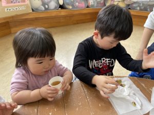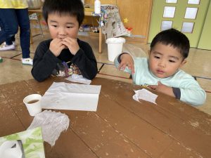 あいにくの雨。予定していた「焼きいも会」は、遊戯室とにこにこホールで行いました。