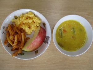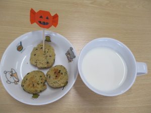 今日の給食メニューは『かぼちゃのシチュー・マカロニのトマト煮・チーズ入りスクランブルエッグ・りんご』でした。また、今日の手作りおやつは『おからクッキー』でした。