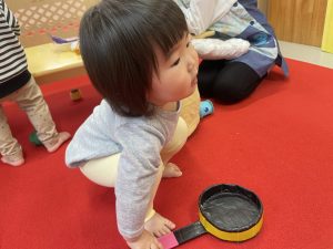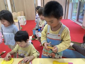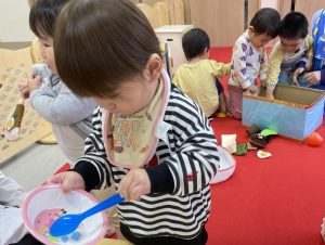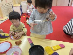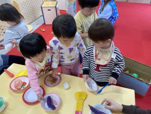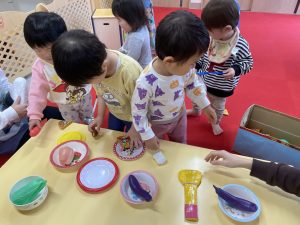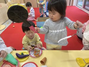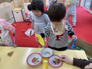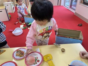 楓1組(1歳児)と桃組(0歳児)はおままごと。このあそびは、本当にさまざまなことを経験できる良いあそびだと思います。