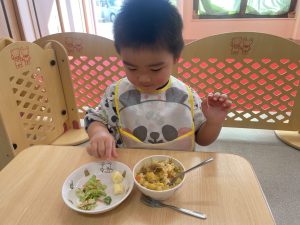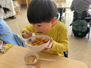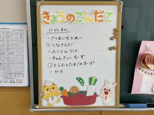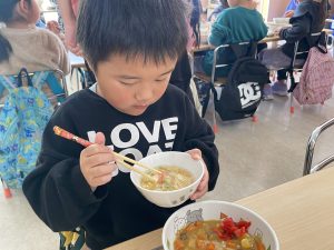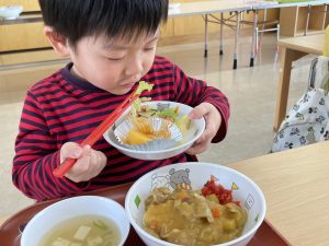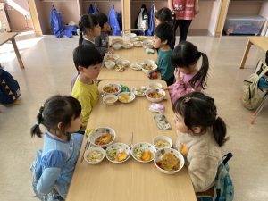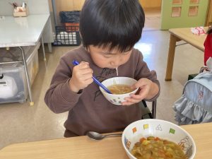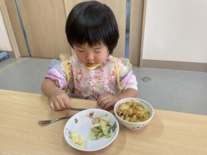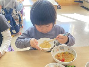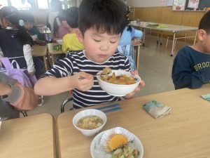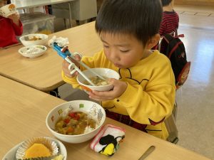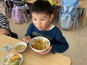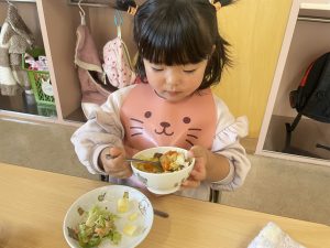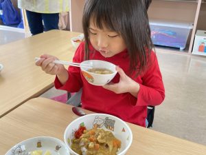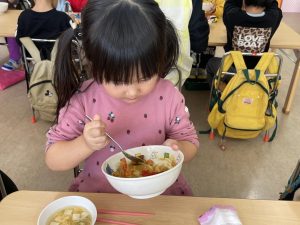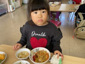 今日の給食メニューは『さつまいもカレー・ツナサラダ・福神漬け・キャンディチーズ・豆腐とたまごのスープ・柿』でした。