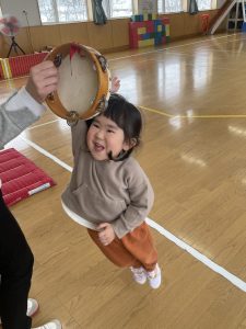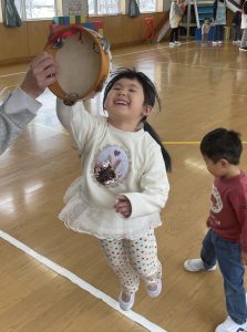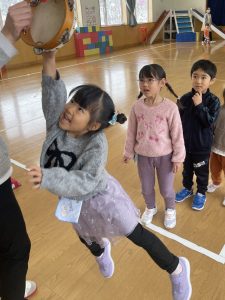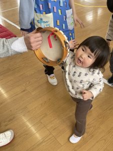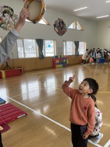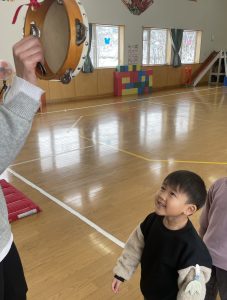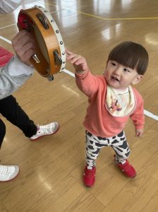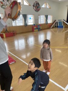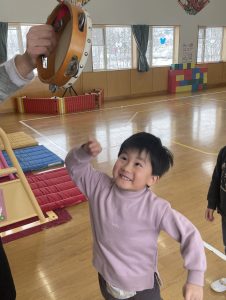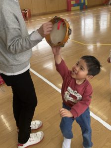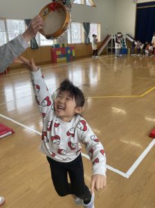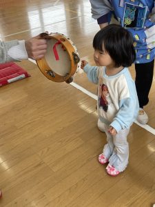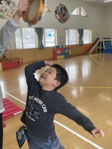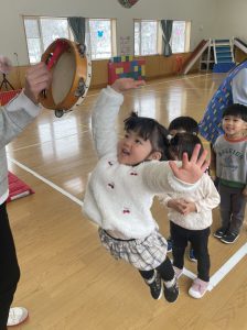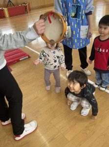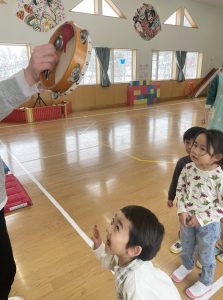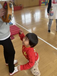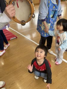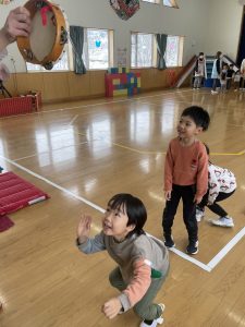 最後は、低床平均台を渡って、タンバリンにタッチして終わりました。(タンバリンタッチは、全園児分の写真を掲載しております)