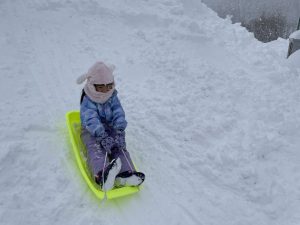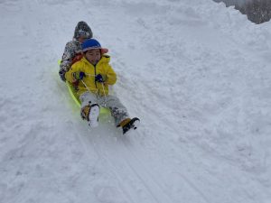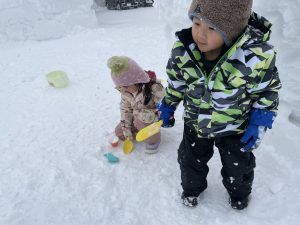 竹・楓2組(4・2歳児)は、晴れたのでお外に出てみるとすぐに吹雪。でも子どもたちは気にすることなくあそび続けます。さすが雪国育ちです!