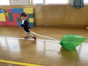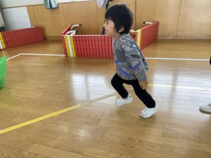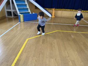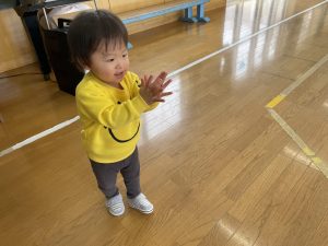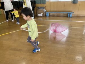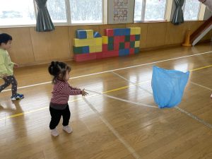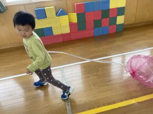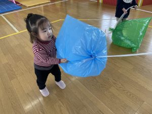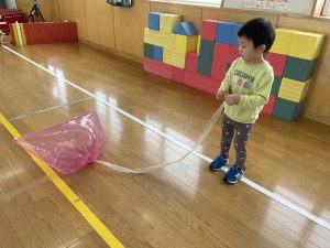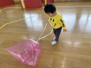 楓1・桃組(1・0歳児)は、遊戯室でポリ袋でつくった風船を引っ張ってあそびました。
