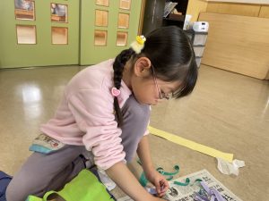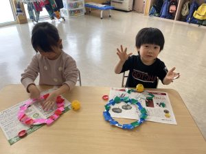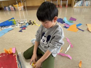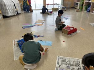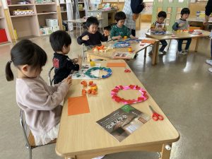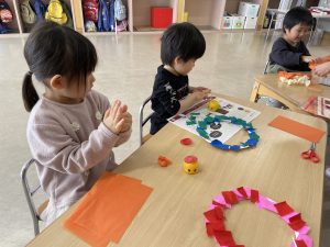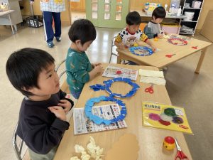 松・桜組(5・3歳児)は、製作。来週、「まめまき集会」があり、子どもたちは、ちょっと不安ながらも楽しみにしているようです。