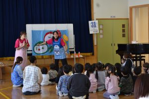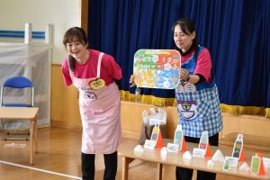 今回は、あおもり食育サポーターの山谷詠子さん(青森市食生活改善推進員会長)と前多敬子さんを講師にお招きし、給食年間目標でもある「あか・き・みどりの食べ物を知る(三色食品群)」についてお話をしていただきました。