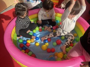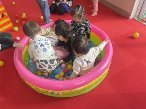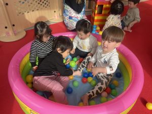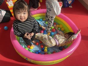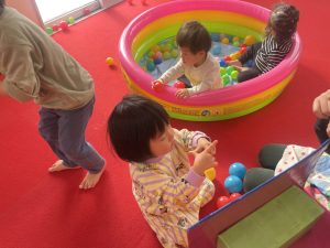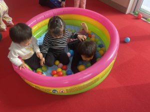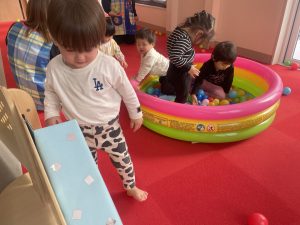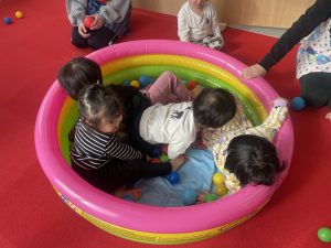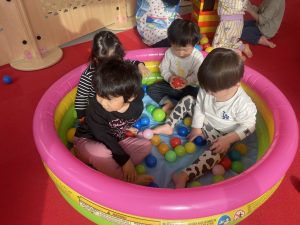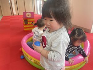 楓1組(1歳児)と桃組(0歳児)は、ボールあそび。プールはいつでも大人気ですね。