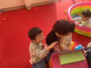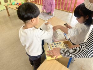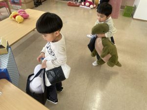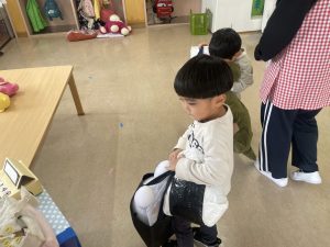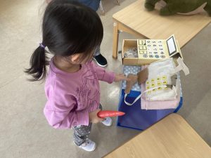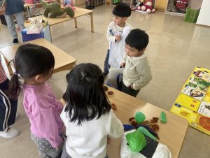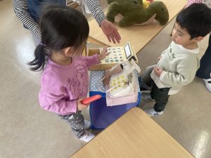 楓2組(2歳児)も「お店屋さんごっこ」の練習。商品を選び、お金を渡し、商品を受け取る・・・。