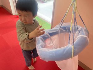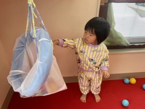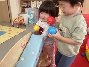 ボールをバスケットゴールのようなものに入れたり、筒状の入れ物を通したりとあそびがどんどん発展していきます。