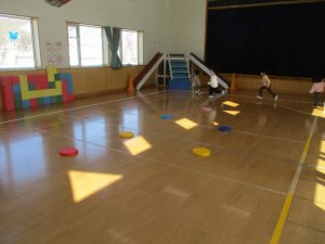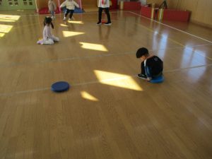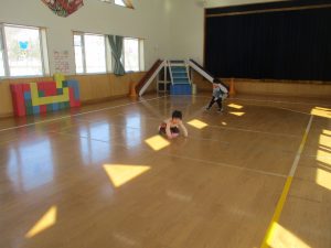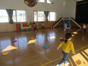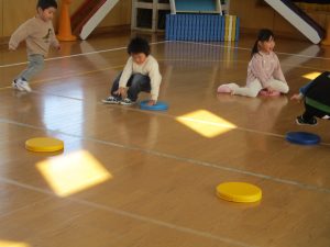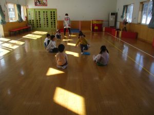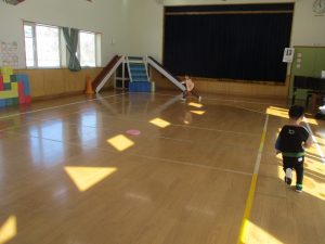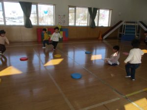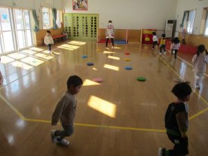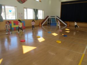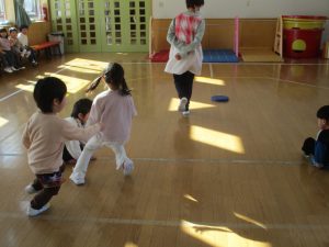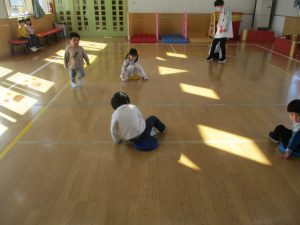 桜組(3歳児)と楓2組(2歳児)は、遊戯室でゲーム。ルールのあるゲームをたくさん経験することはとても大切ですね。