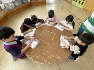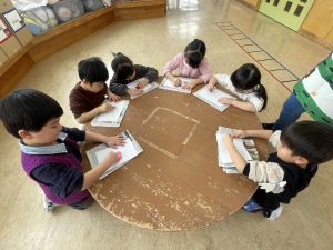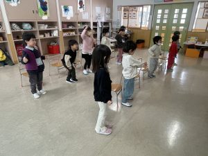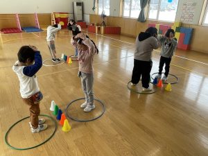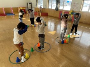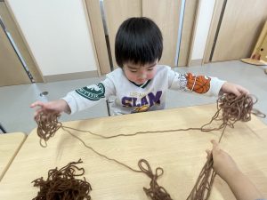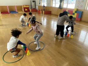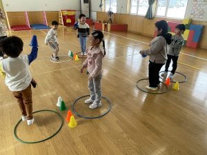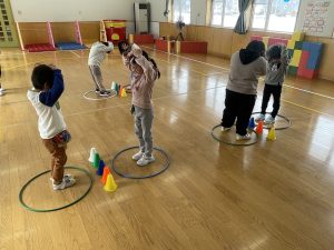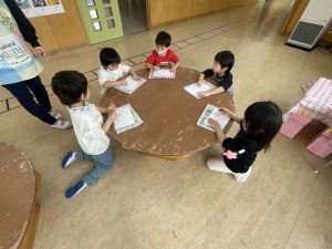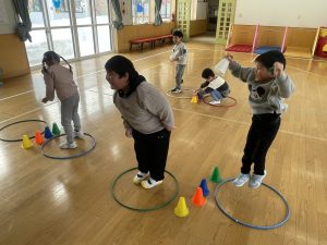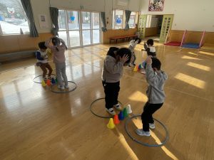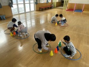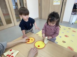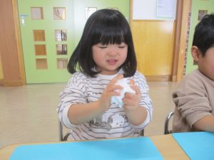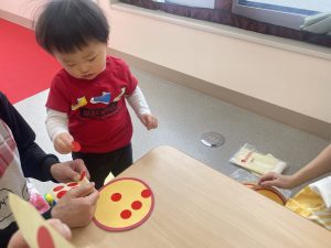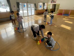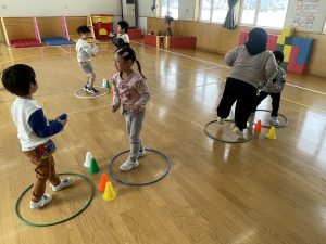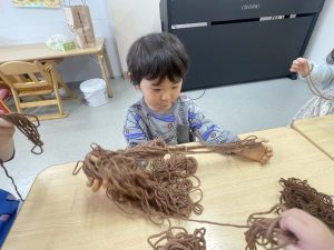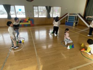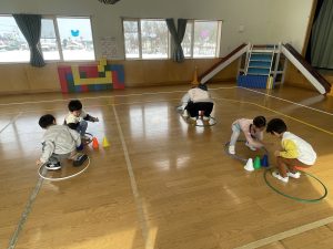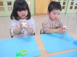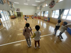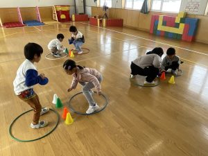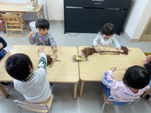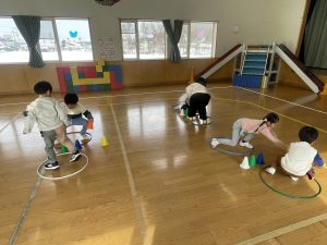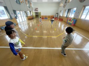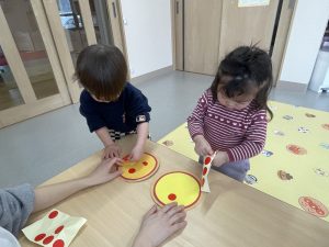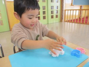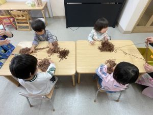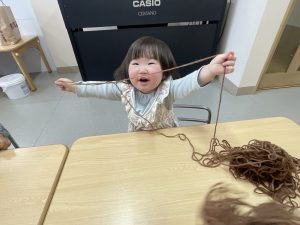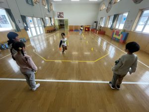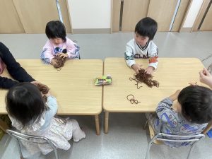 前半は「お店屋さんごっこ」に向けた製作など。後半は遊戯室などで思いっきり楽しくあそびました。