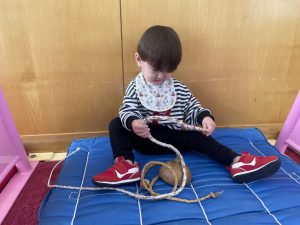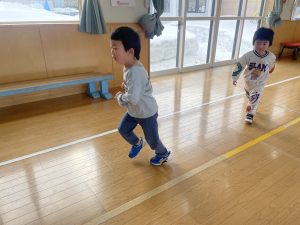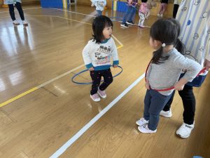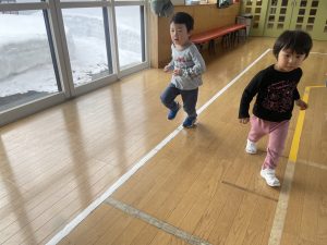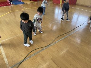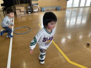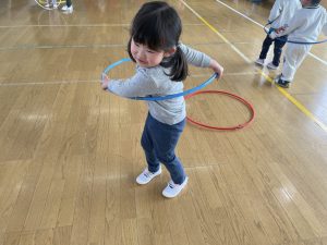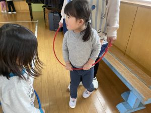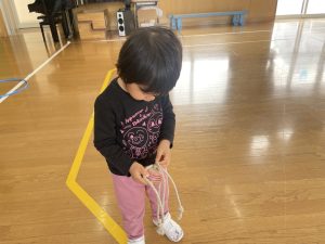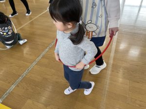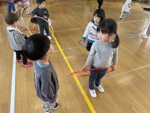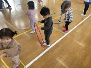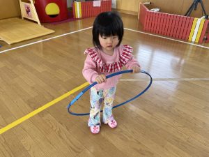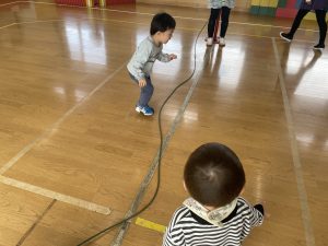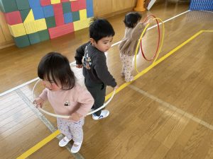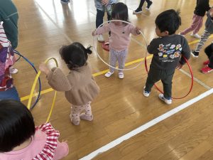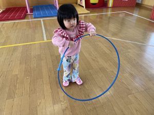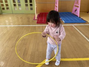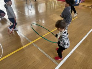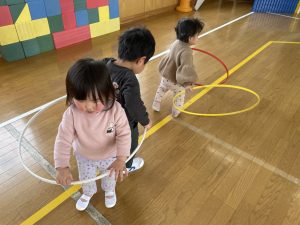 楓・桃組(2・1・0歳児)は遊戯室で、長縄、フープ、ずぐりなどであそびました。走るのが大好きな子もたくさんいますよ。