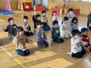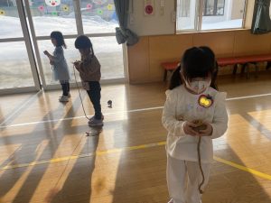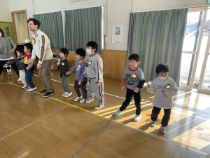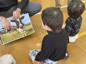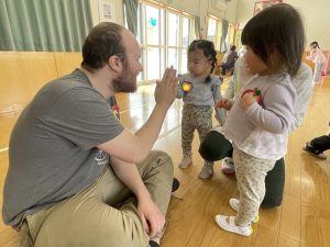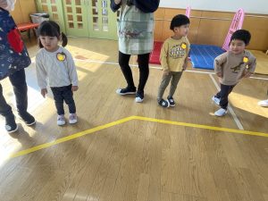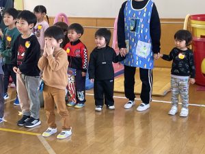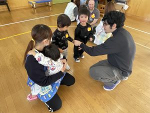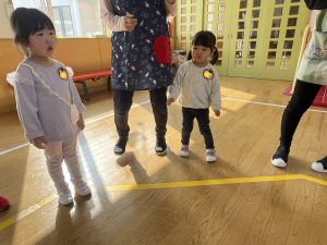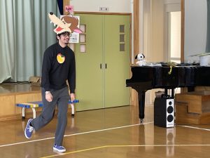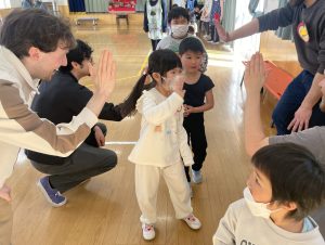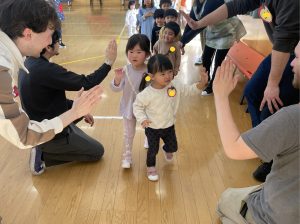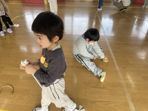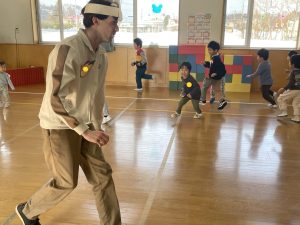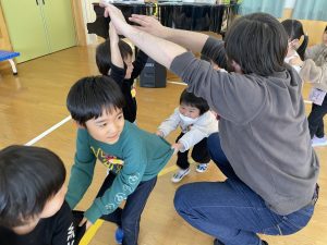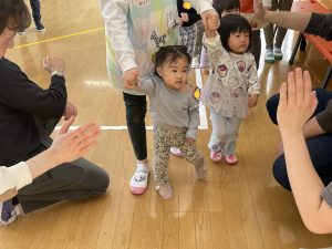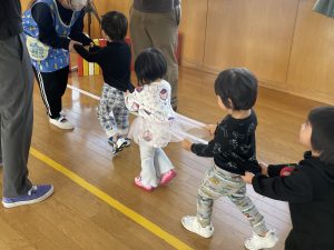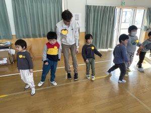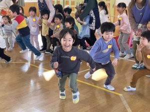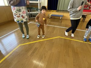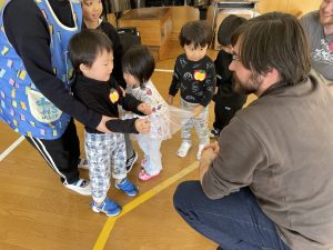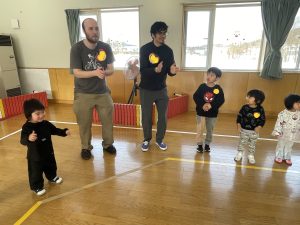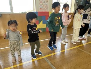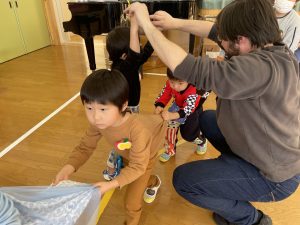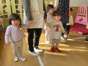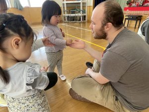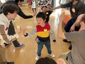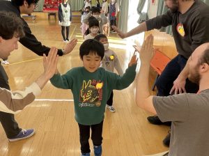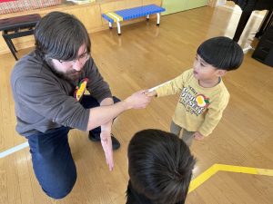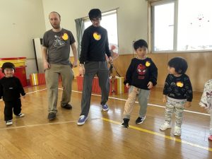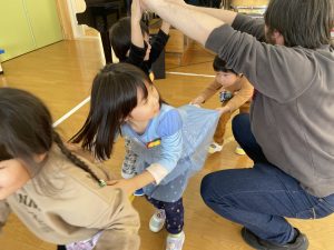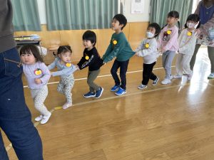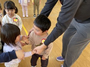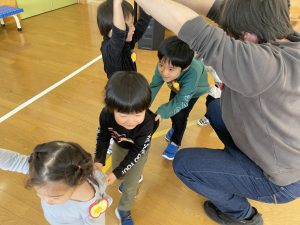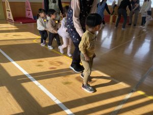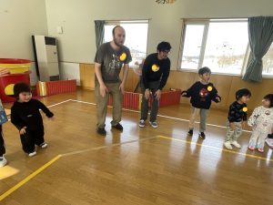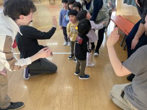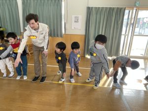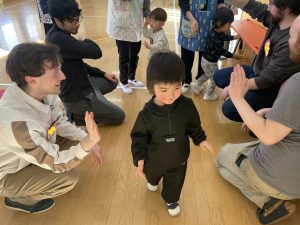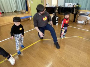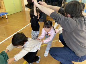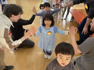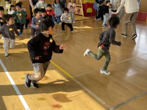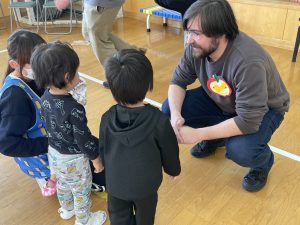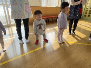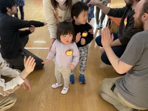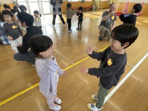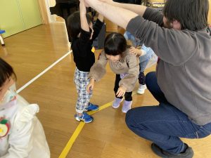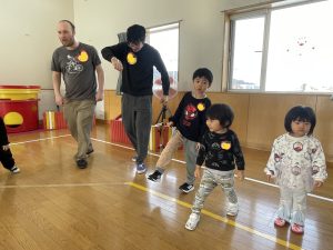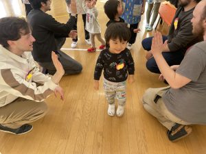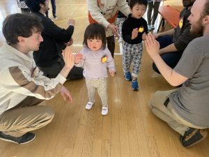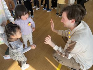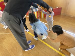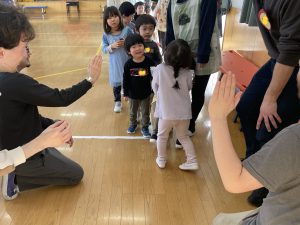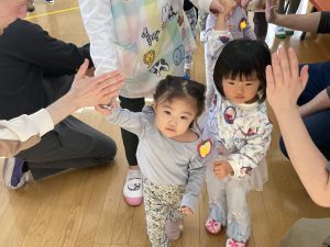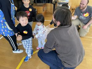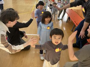 その後♪LondonBridgeや♪HokeyPokeyを一緒に身体を動かして歌ったり、「狼さん、今、何時?」の鬼ごっこも大喜びでした。
