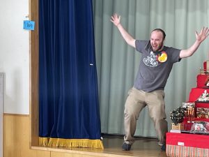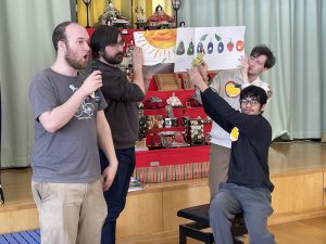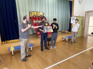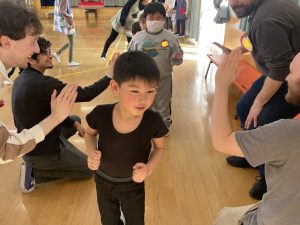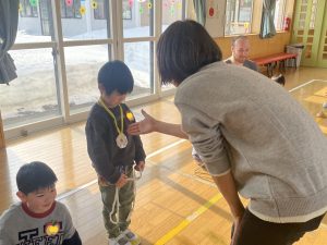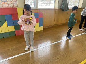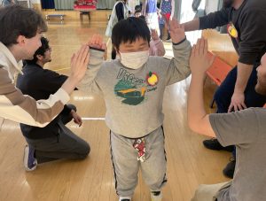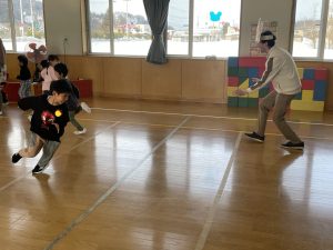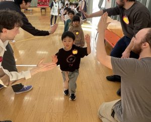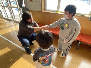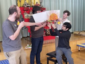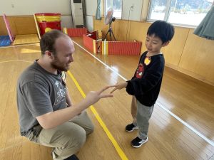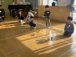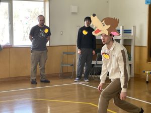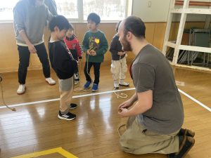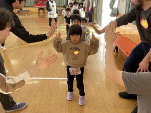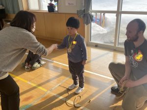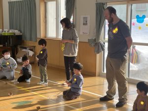 まずはアイスブレイクの「ずぐり回し大会」。今日のために熱心に練習を積んできた子もたくさんいました。子どもたちは先生たちにずぐりの回し方を英語を交えながら教え、いよいよ本番!うまく回せた子、思いが強すぎて力が入り、失敗してしまった子等々…色々なドラマがありました。オリンピック期間中ですので、金メダル、銀メダル、銅メダルを贈呈。目標に向かって頑張ることの大切さを学べたのではないかと感じました。
