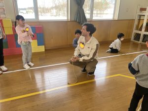 今日は毎年恒例、黒石市の出前講座「私の見た黒石市・日本」を活用し、黒石市の小中学校に配属されているALTの先生方4人にご来園いただき、みんなで「えいごであそぼう」を楽しみました。
