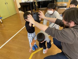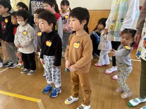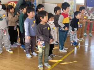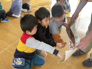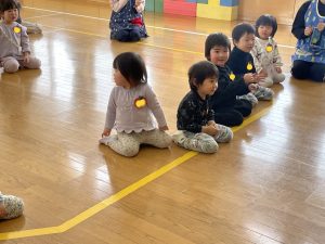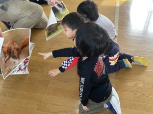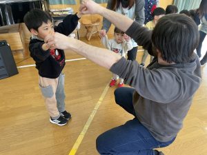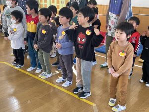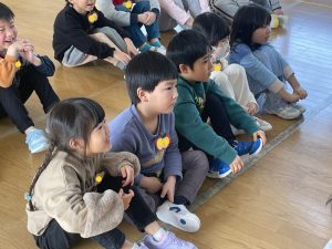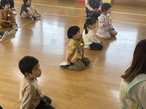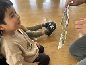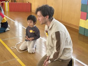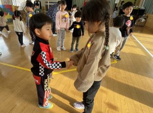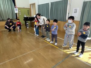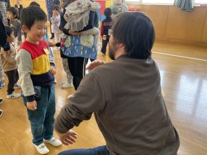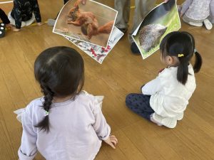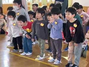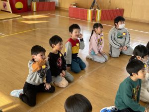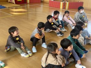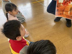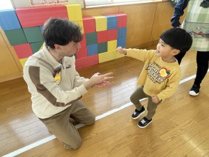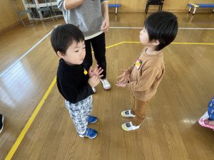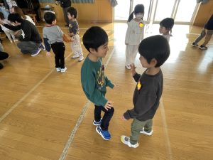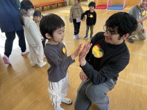 ♪Hi !How are you?や♪Skidamarink(すきだまりん)の歌を一緒にうたって、自己紹介タイム。みんな練習の成果を発揮し、Hi!What’s your name?~Nice to meet you,too!と元気に会話できていました。