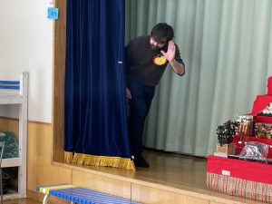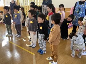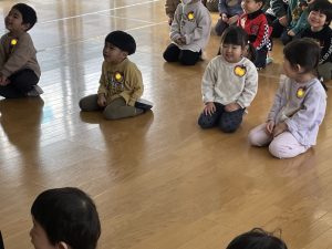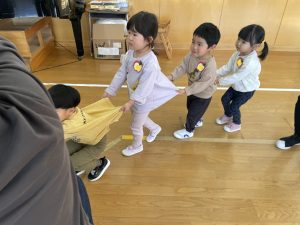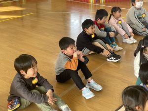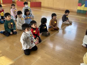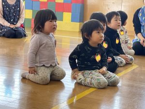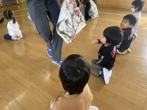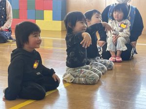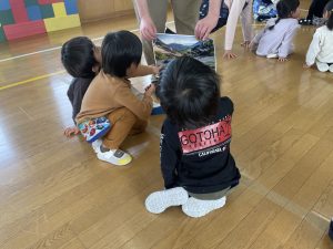未満児さんも合流し、「えいごであそぼう」スタートです。みんなでお名前を呼ぶと、カーテンの後ろからHello!と現れた先生方。