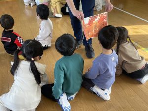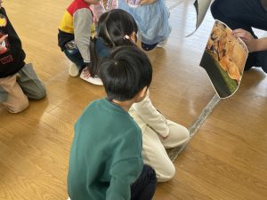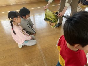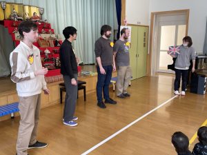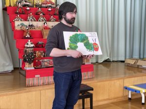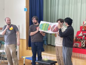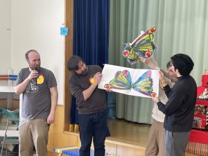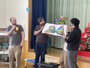 それから英語の大型絵本『はらぺこあおむし』を4人で読んでくれました。蝶々が誕生したときは、歓声が上がりましたね。
