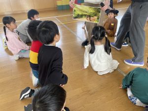その後、アメリカ、イギリスの国について、それぞれの先生が動物や景色など楽しく教えてくださり、子どもたちは興味をもって質問したり楽しそうに聞いていました。
