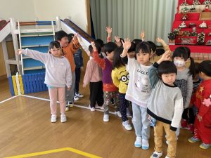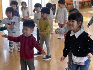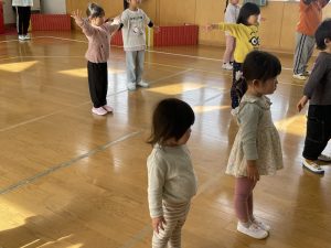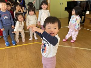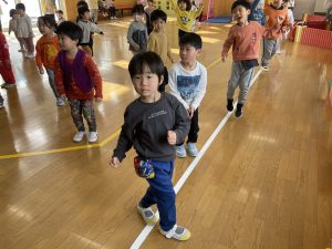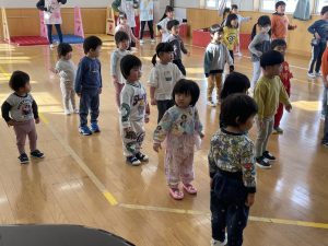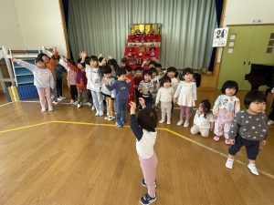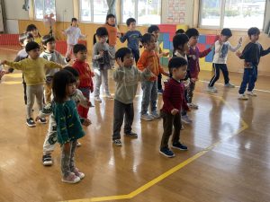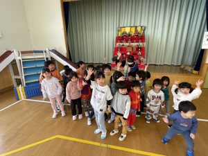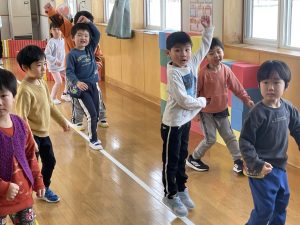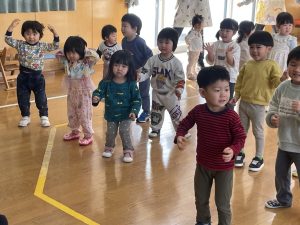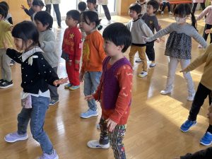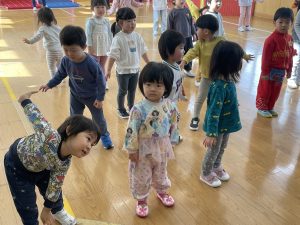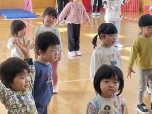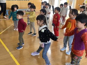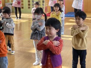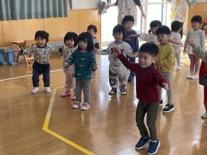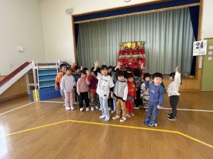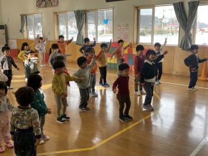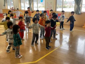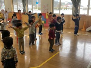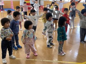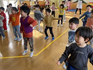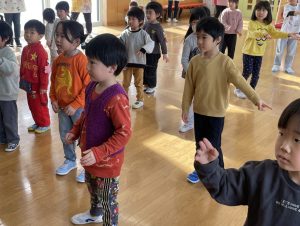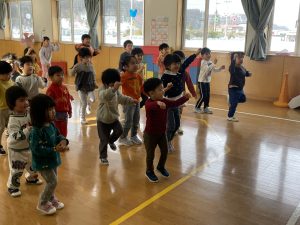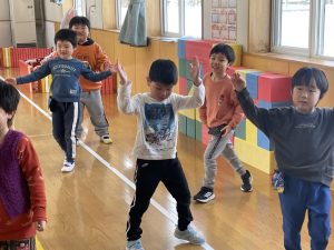 朝会、表彰(黒石市子ども美術展受賞)の後、今週の体操も「青の煌めきダンス」。ダンスの最後に一か所に集まるのは、初めてでしたがうまくできました。