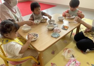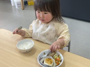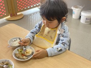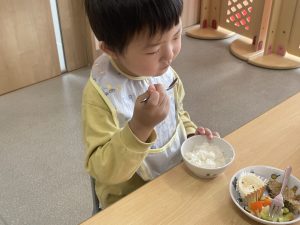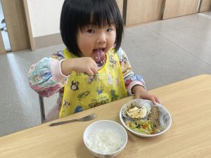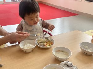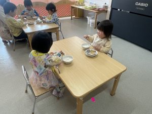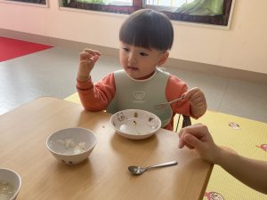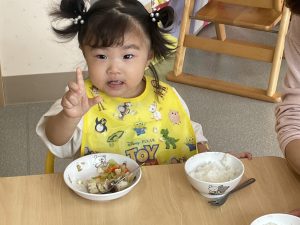楓1組(1歳児)と桃組(0歳児)は、給食の様子をご覧ください。