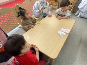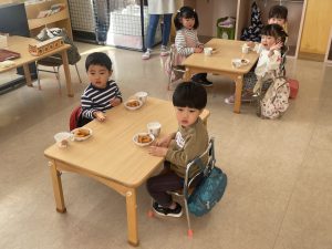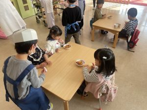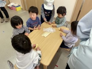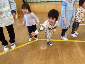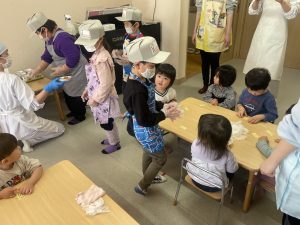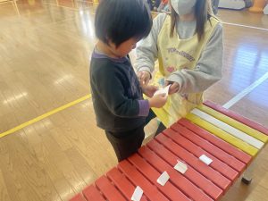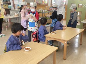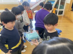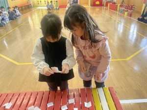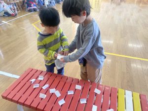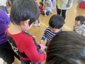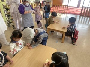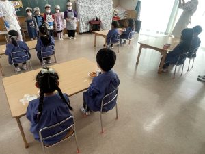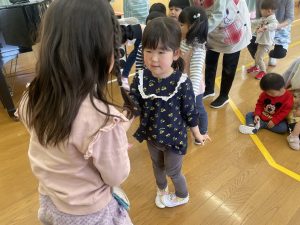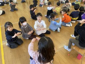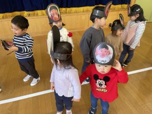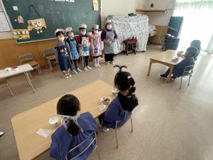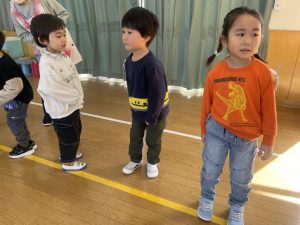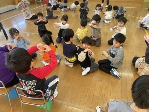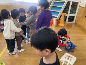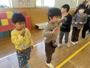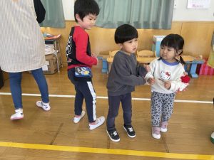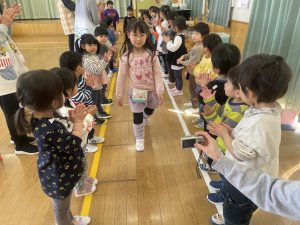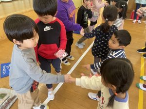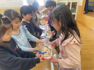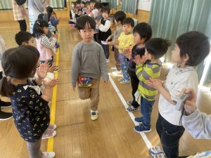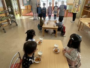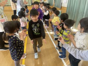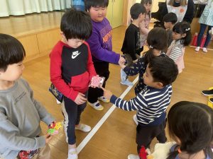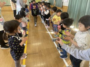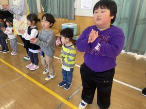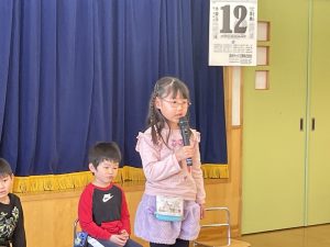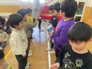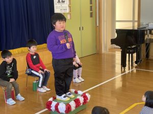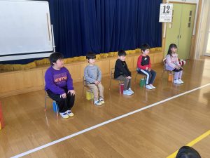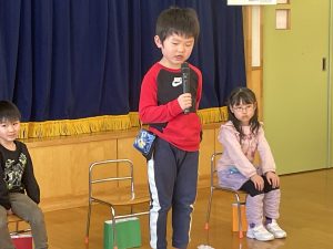 今日は、松組(5歳児)との「お別れ会」。卒園児が一人ずつ「小学校で頑張りたいこと」を発表。とても立派でした。
