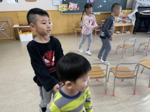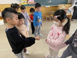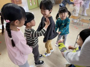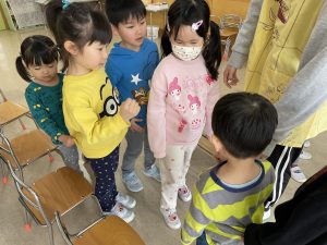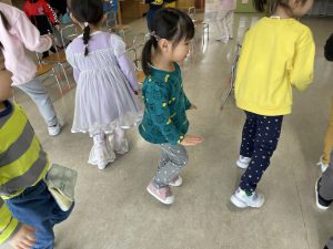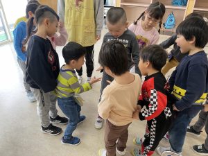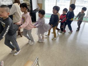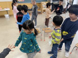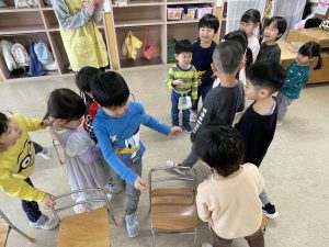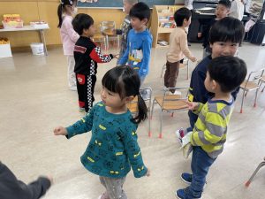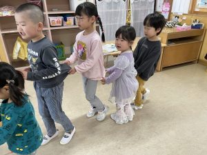 松・竹・桜・楓2組(5・4・3・2歳児)は朝会から一緒に過ごしました。朝会後は、大好きな貨物列車をしました。また、カルタ取りやイス取りゲームもしました。後半は遊戯室で思いっきりあそんでいました。