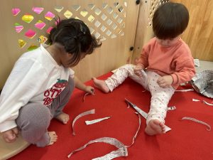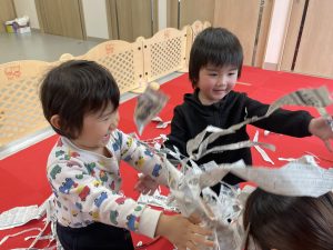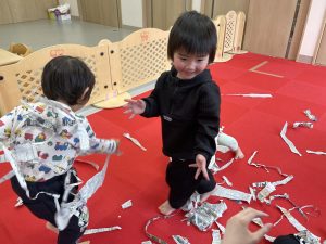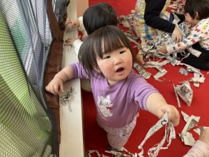 楓1・桃組(1・0歳児)は、新聞紙をビリビリ。このようなあそびは、なかなかお家ではできないのではないでしょうか。思いっきりあそんでいました。