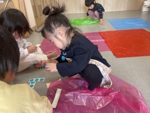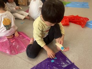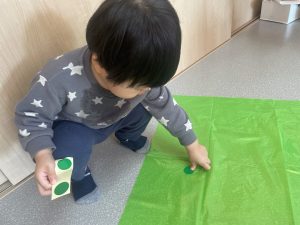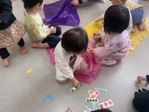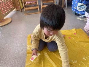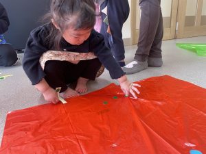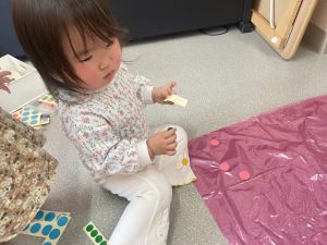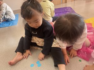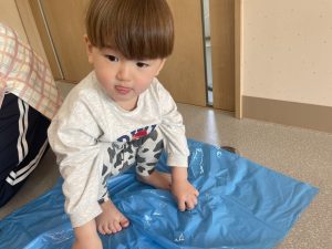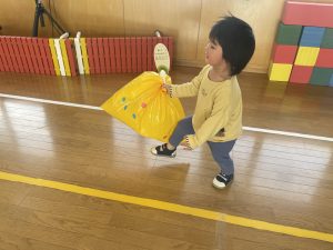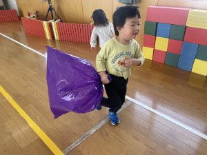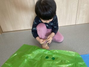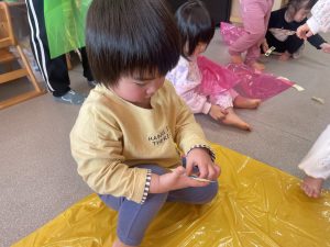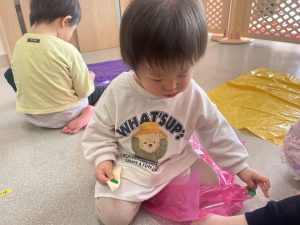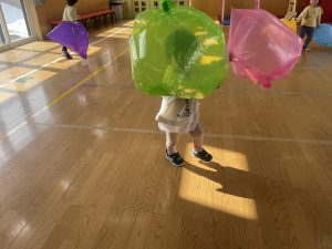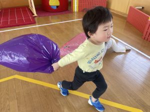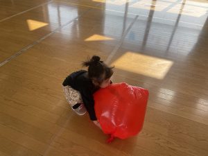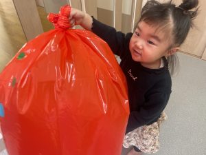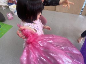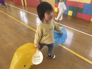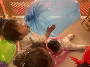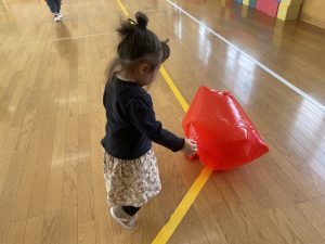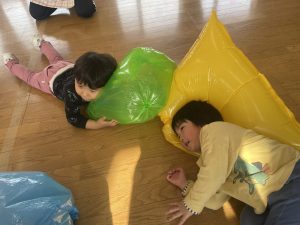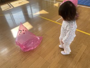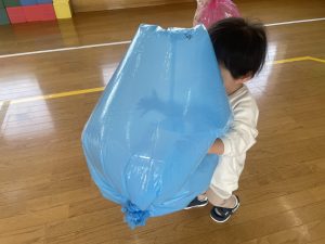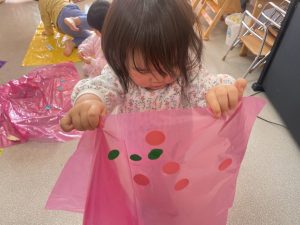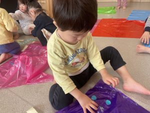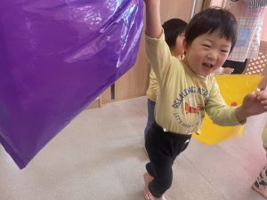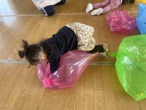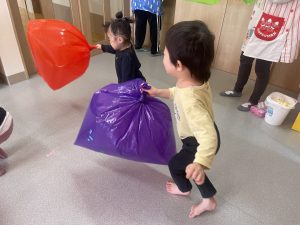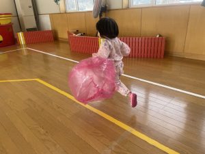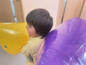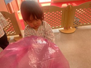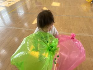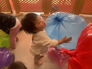 楓1・桃組(1・0歳児)は、カラーポリ袋に思い思いにシールを貼って、膨らませると、風船ボールの完成です。遊戯室で飛ばしてあそびました。