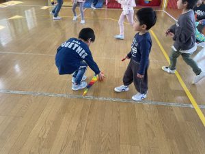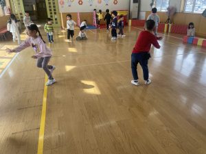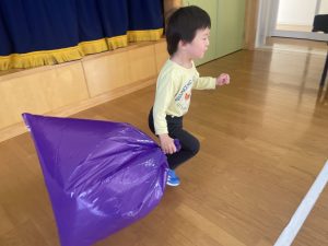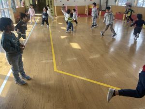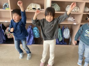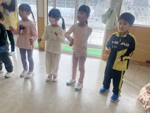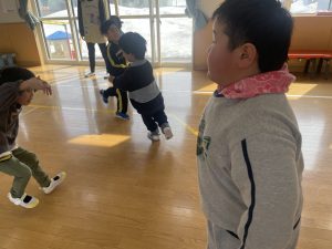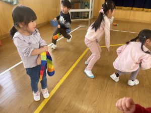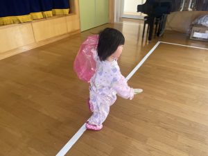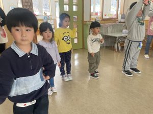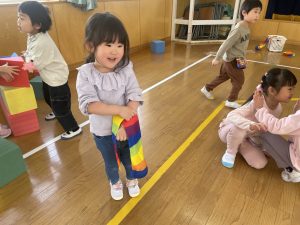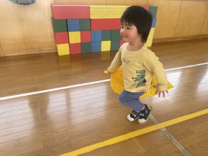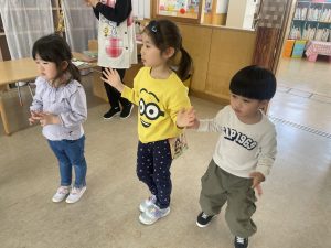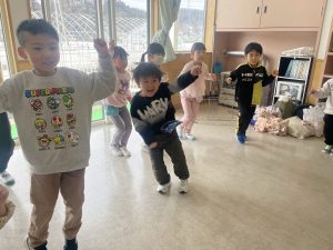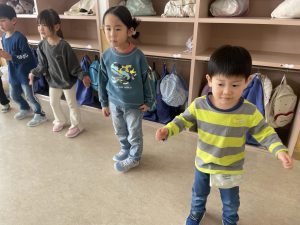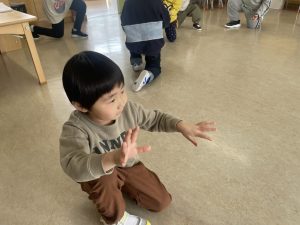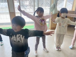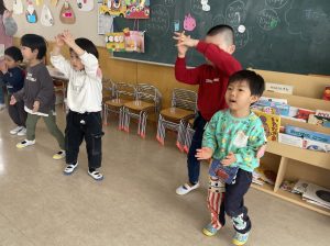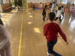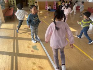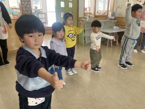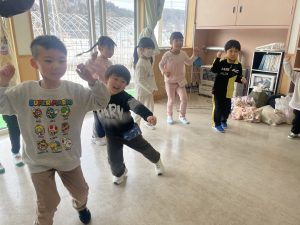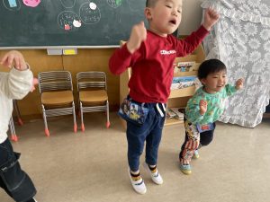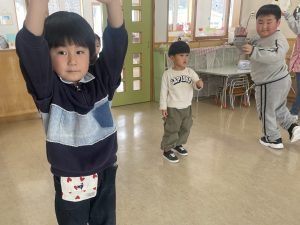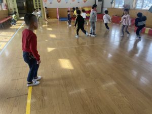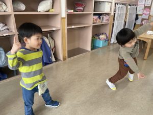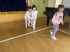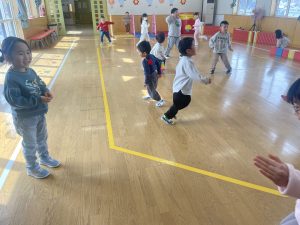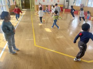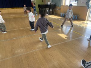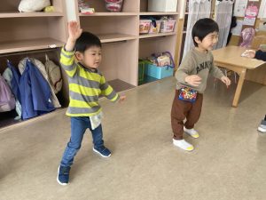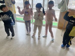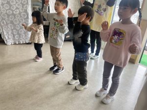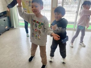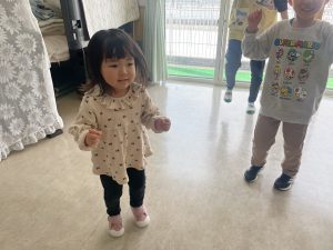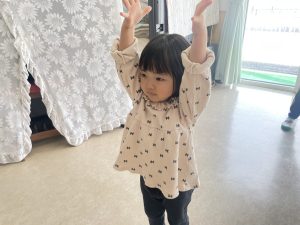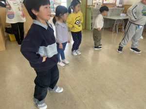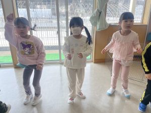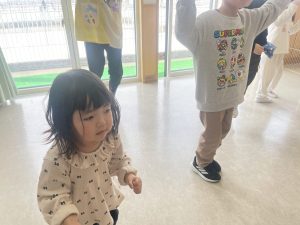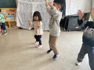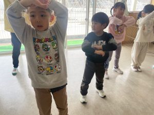 大好きなディズニー体操やおゆうぎ会で踊った曲をみんなで踊りました。最初は分からなくてもみんなのを見ながら、最後は一緒に楽しく踊っていましたよ。