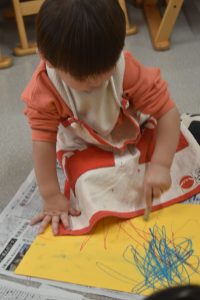 エプロンに付いても問題なし。足に付いても大丈夫。画用紙からはみ出てもいい。