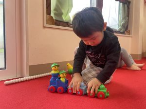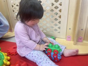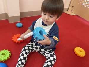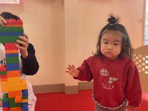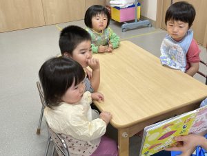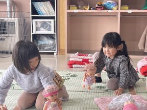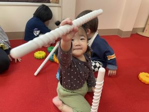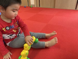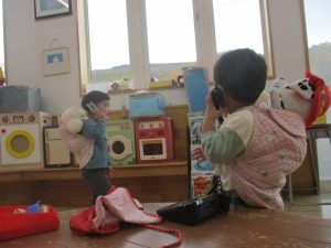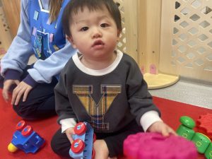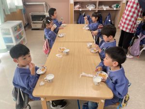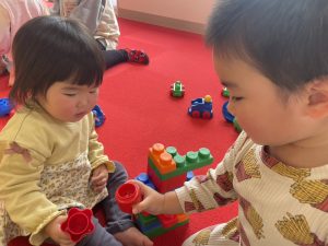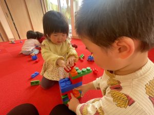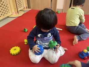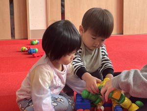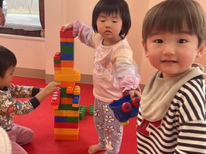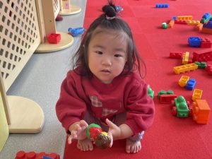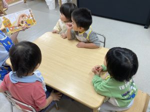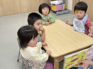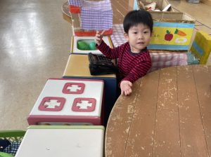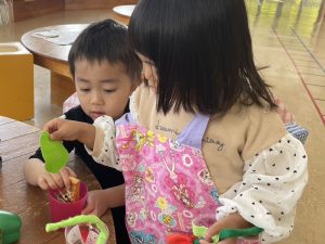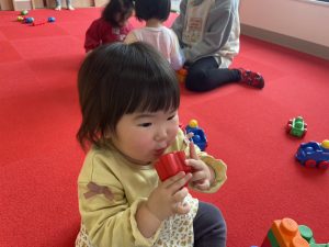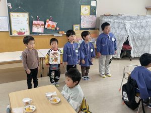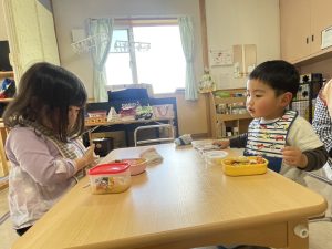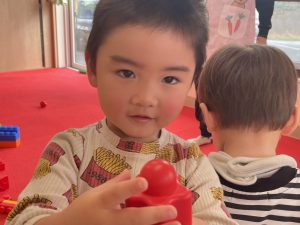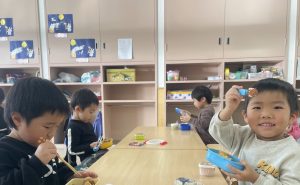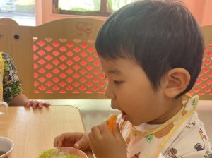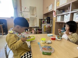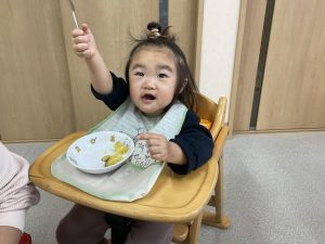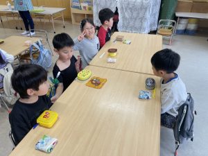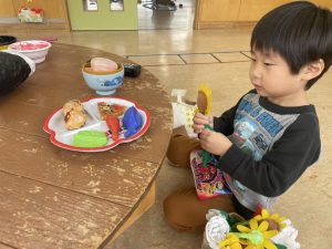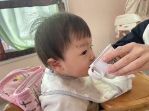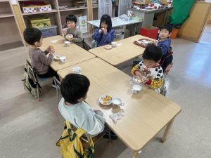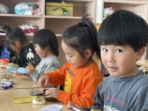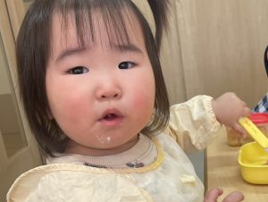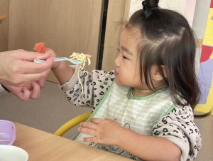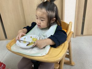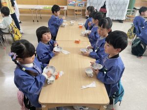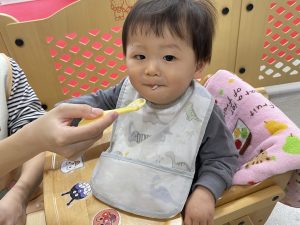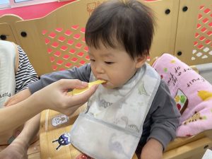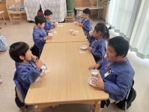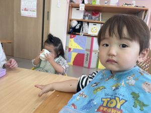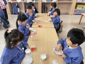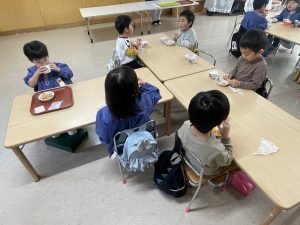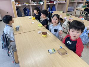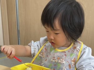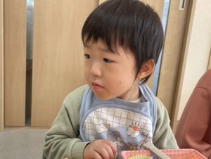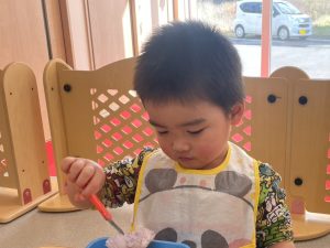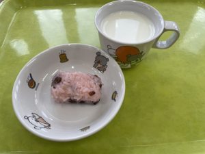 今日のおやつは「お赤飯」でした。七五三のお祝いということで、健康ですくすく育つよう願いを込めて。