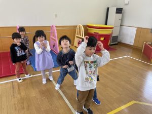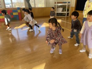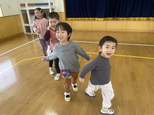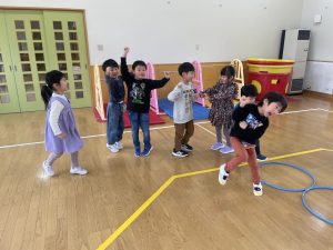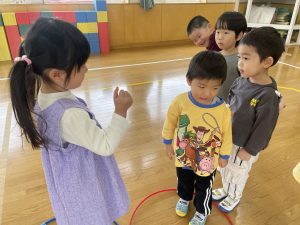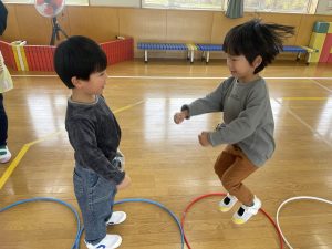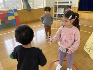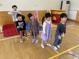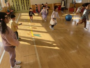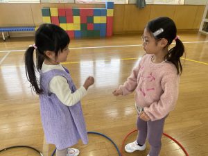 松組(5歳児)、竹組(4歳児)、桜組(3歳児)は、みんなでフラフープを使ってあそんだり、