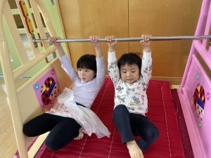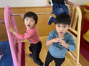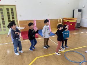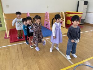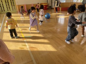 3~5歳児(桜組、竹組、松組)、0~2歳児(桃組、楓組)とそれぞれ一緒にあそびました。