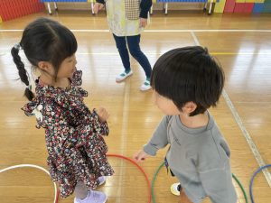 楓2組(2歳児)は、フラフープを使ってあそびました。元気いっぱいです。