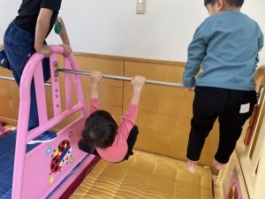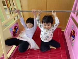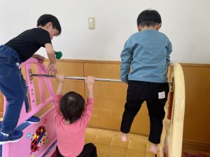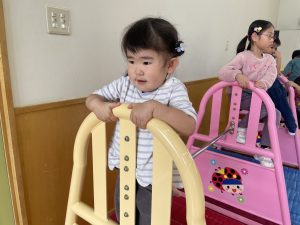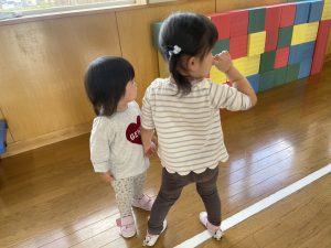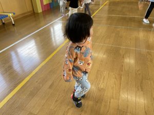 楓組(2・1歳児)、桃組(0歳児)はお部屋であそんだあと、遊戯室へ。