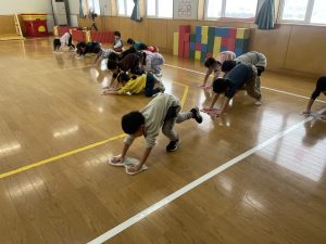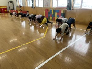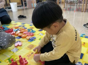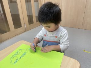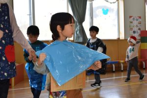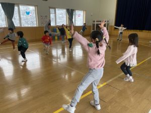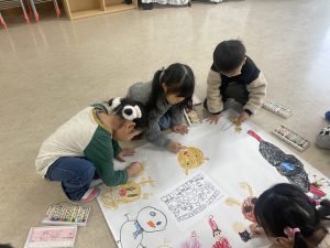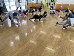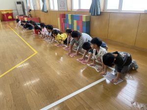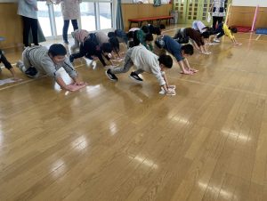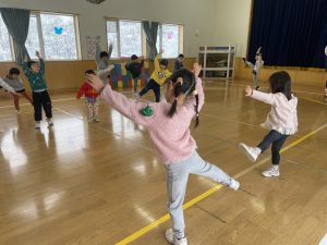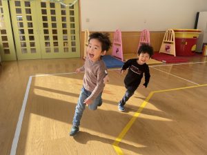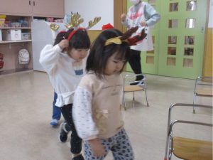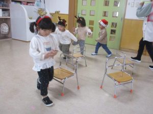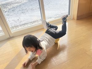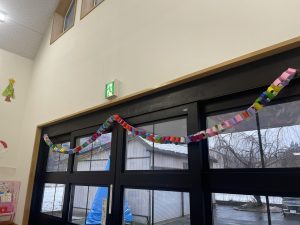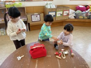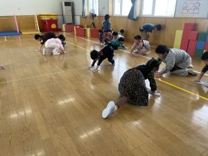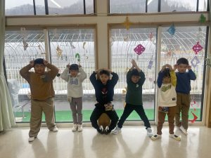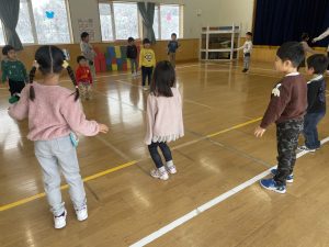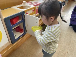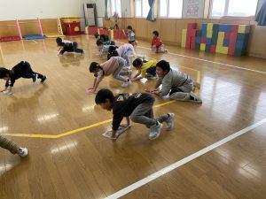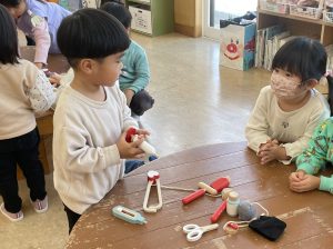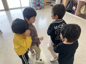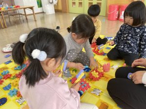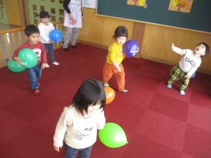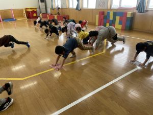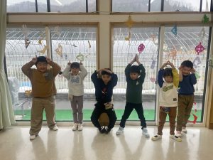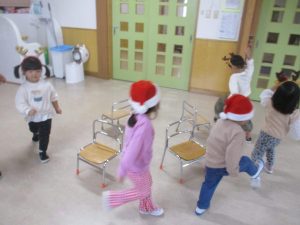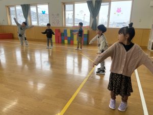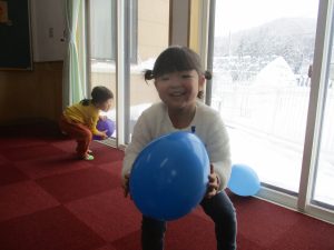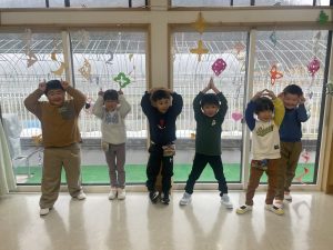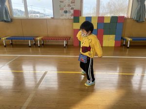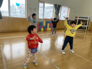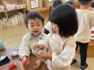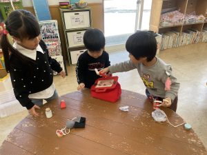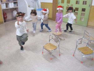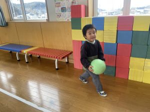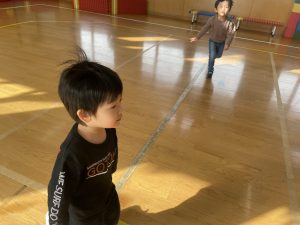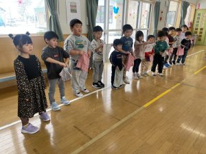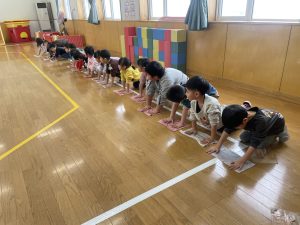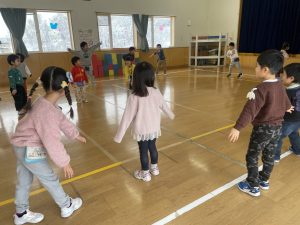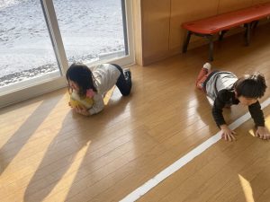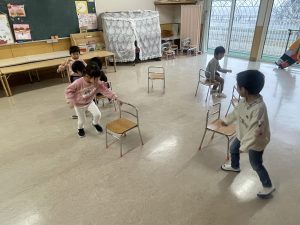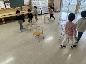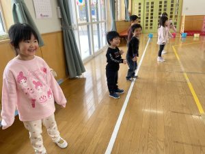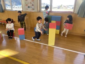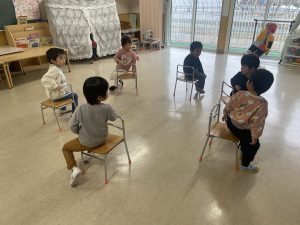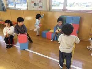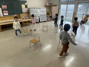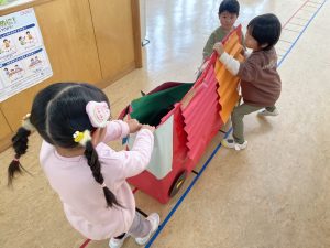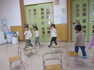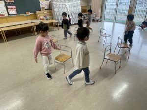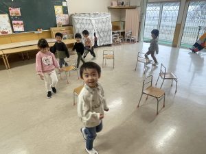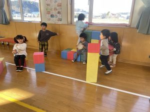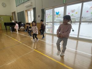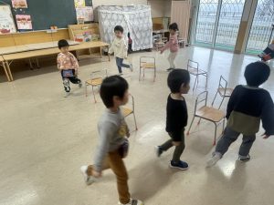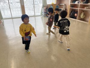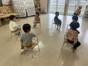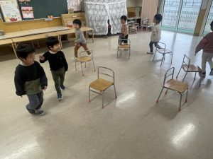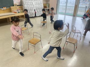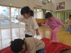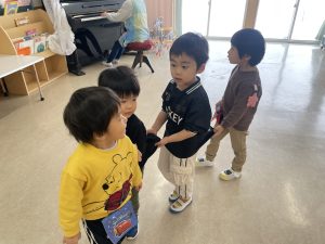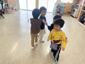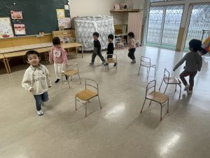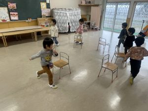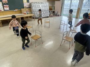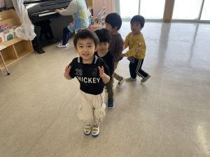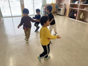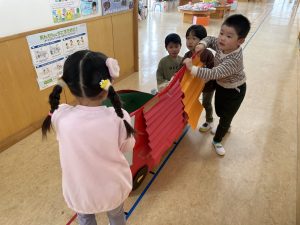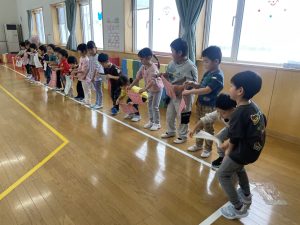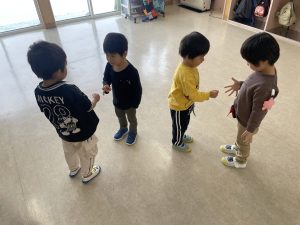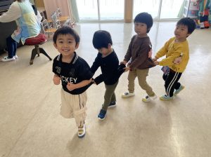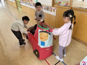 桜組(3歳児)は、みんな大好き貨物列車をやって、そのあと遊戯室でもあそびました。