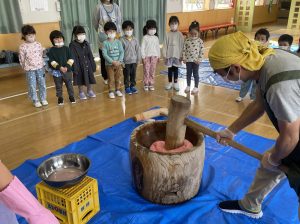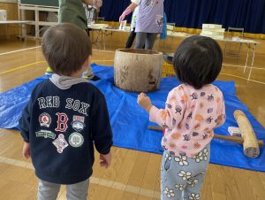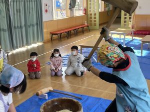 お父さん方の杵を振り上げる迫力やついたときの大きな音に、子どもたちは少し驚いた様子でした。
