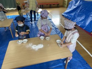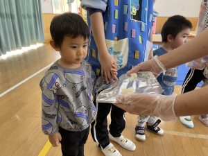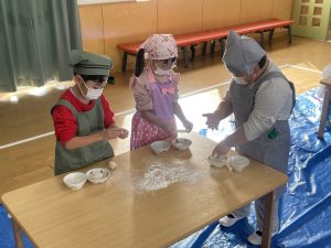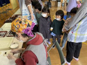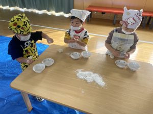 さて、3~5歳児は、自分で食べる分のお餅を自分でちぎって準備し、給食で美味しくいただきました。