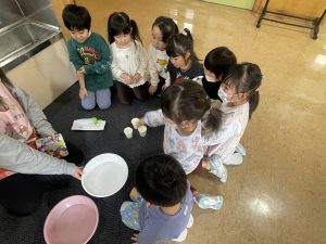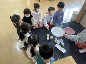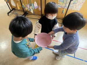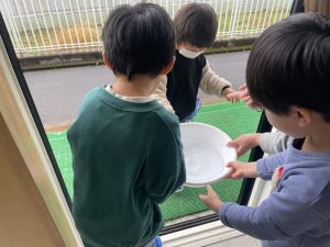 明日は大雪という天気予報。寒くなる予想でしたので、竹組(4歳児)の実験が再開しました。