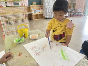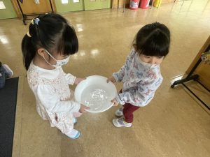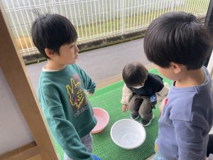 洗面器や紙コップ、風船などに水を入れて、お外へ。明日、どうなっているか楽しみですね。