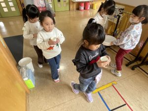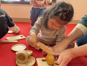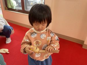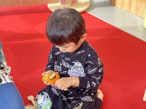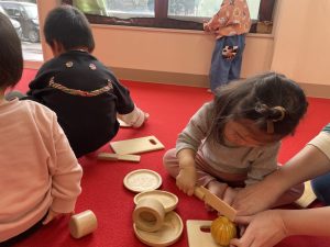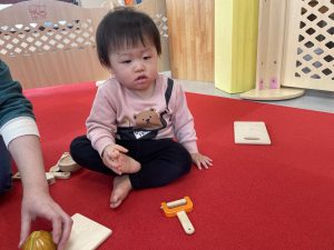 楓1組(1歳児)と桃組(0歳児)は、大好きなおままごとあそび。いろいろな会話が楽しめるようになってきましたね。